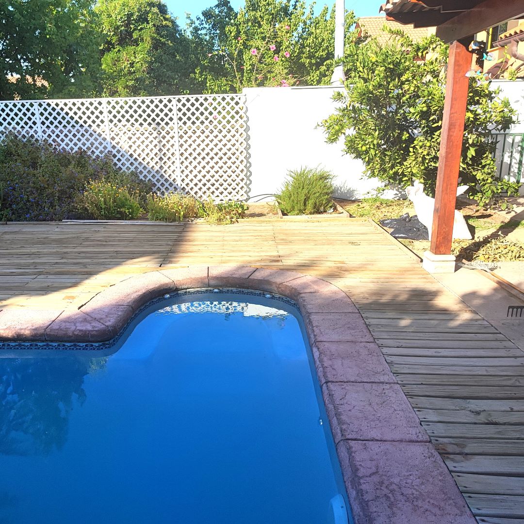 Tabla para deck de terraza al exterior, de pino impregnado y cepillado. Esta tabla tiene sus cantos redondeados para mayor comodidad al caminar sobre ella.